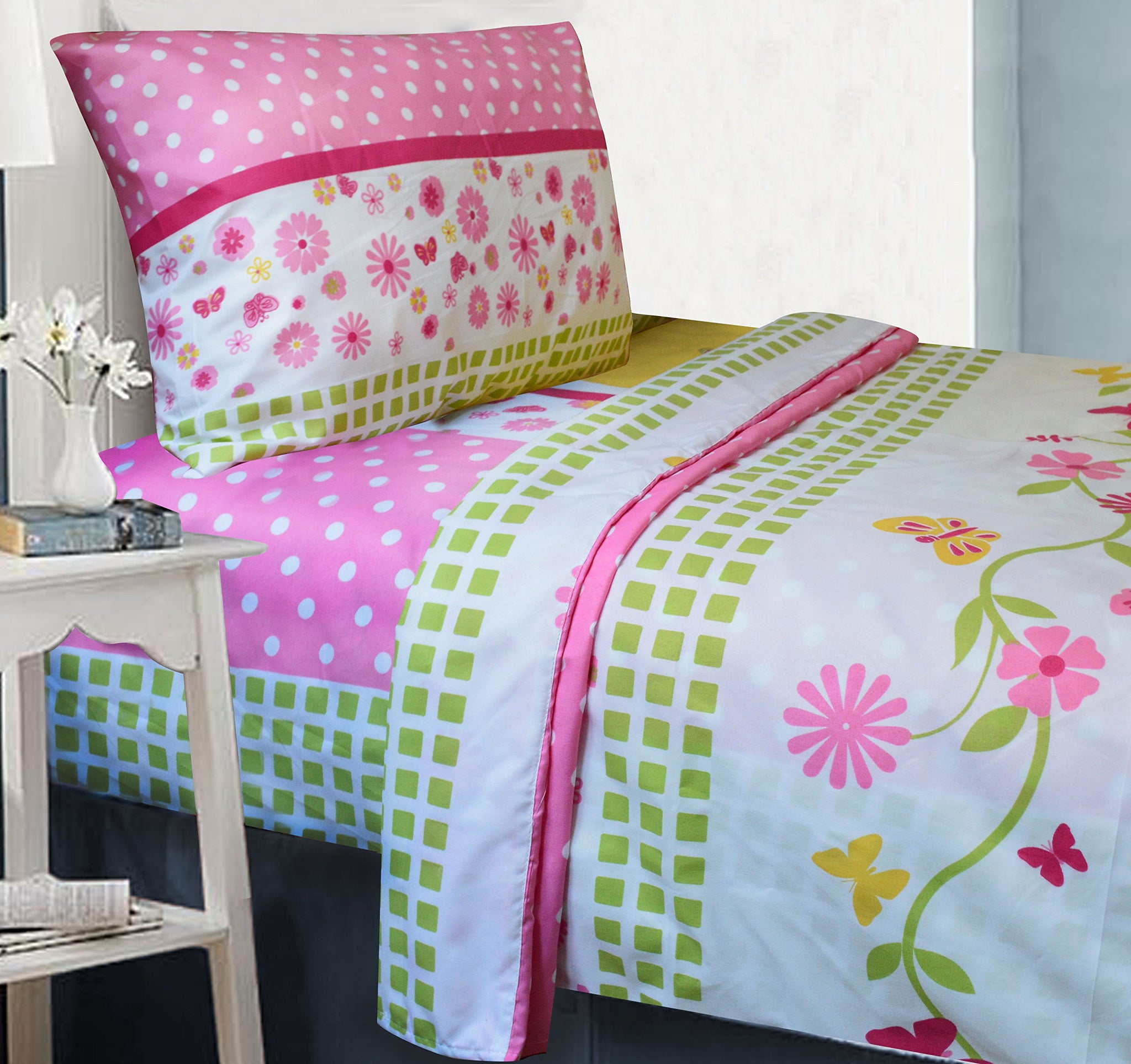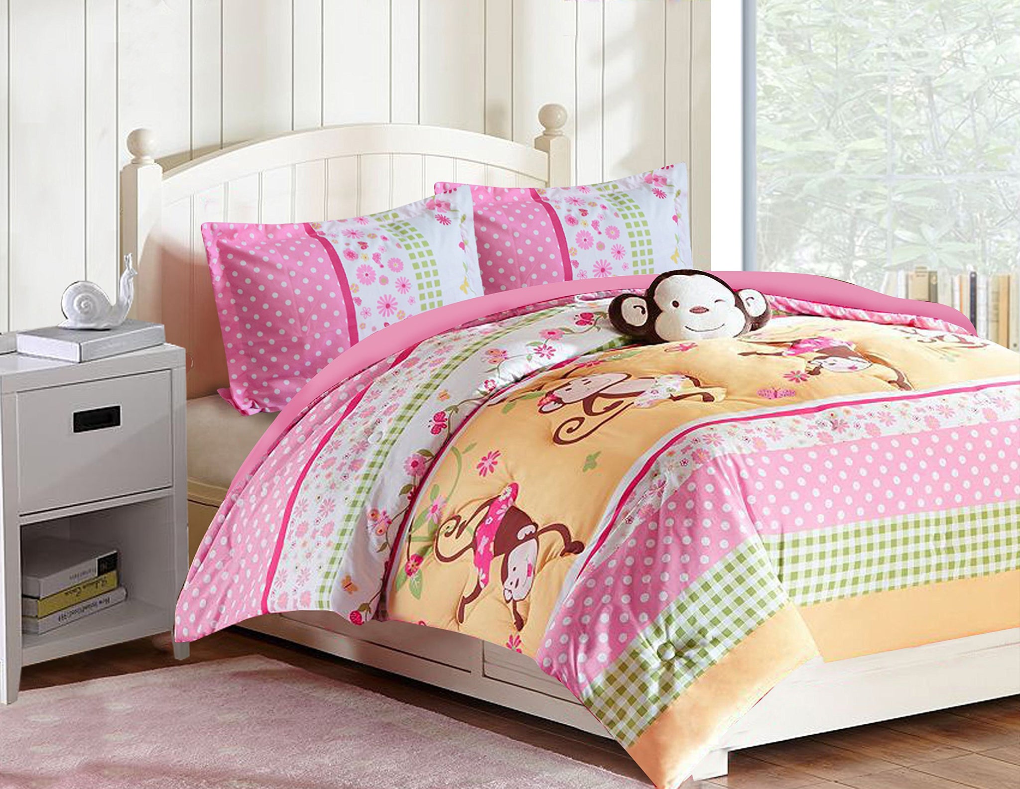 Details: Upgrade your child's bedroom into the cutest pad in the jungle with the Monkey Business comforter set. The comforter forms the centerpiece of the room with a design of happy monkeys hanging around an eclectic pattern of checks, flowers and polka dots. The vibrant color scheme of yellow, pink, green and white is carried through to the included pillow sham. Comforter measures 64" x 86" There's also a cute accent cushion in the shape of a winking monkey's face that's guaranteed to be your child's new favorite friend! Be sure to check out the matching curtain and sheet sets for a complete bedroom makeover.